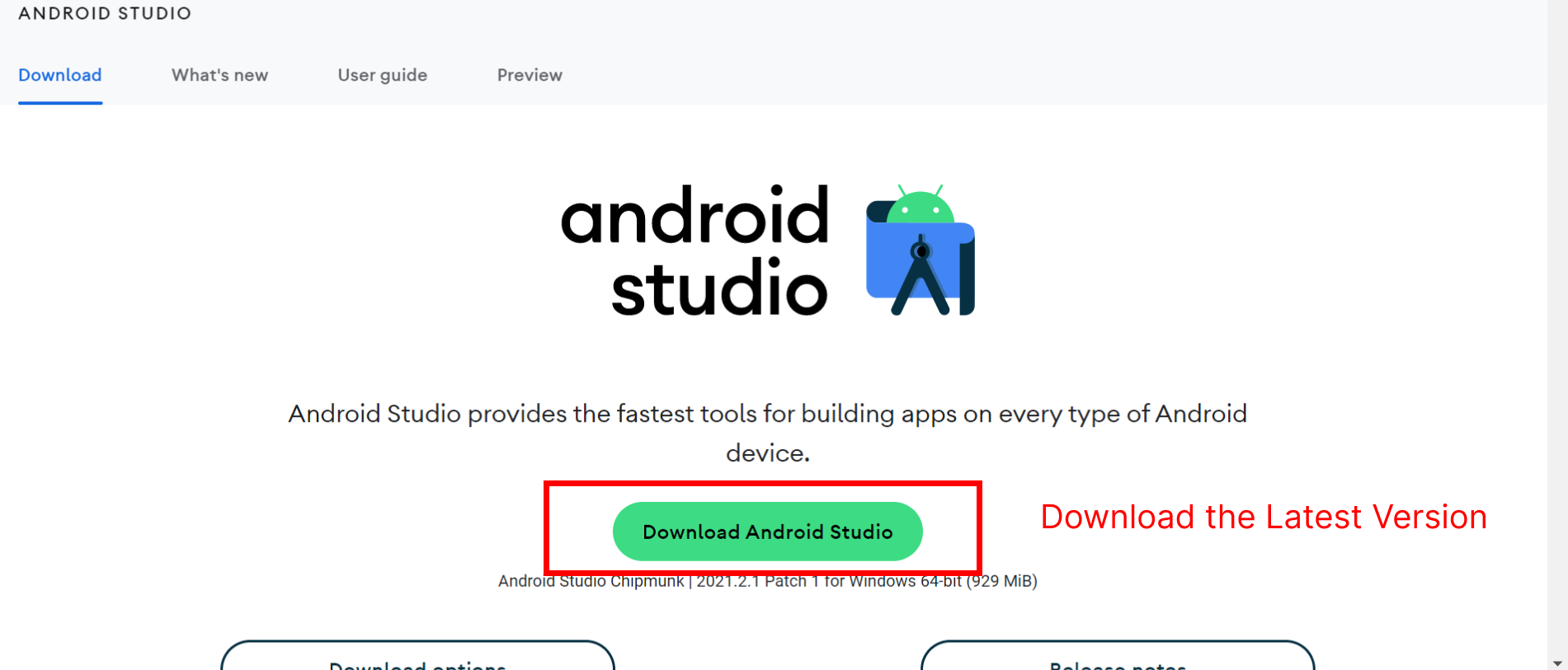 To use this project you need to download the android studio on your computer first you need to visit this link (click button below) then click the button "DOWNLOAD ANDROID STUDIO" to get the latest version for your system