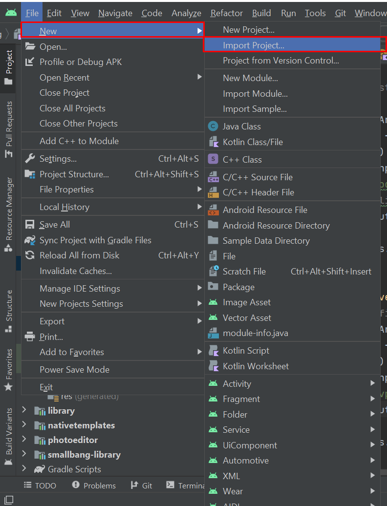 1. In Menu, click File > New > Import Project, and select the project file. .
