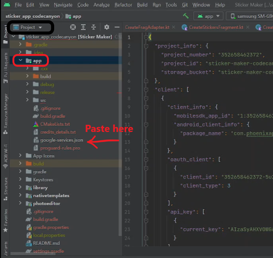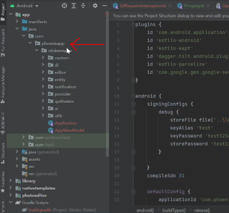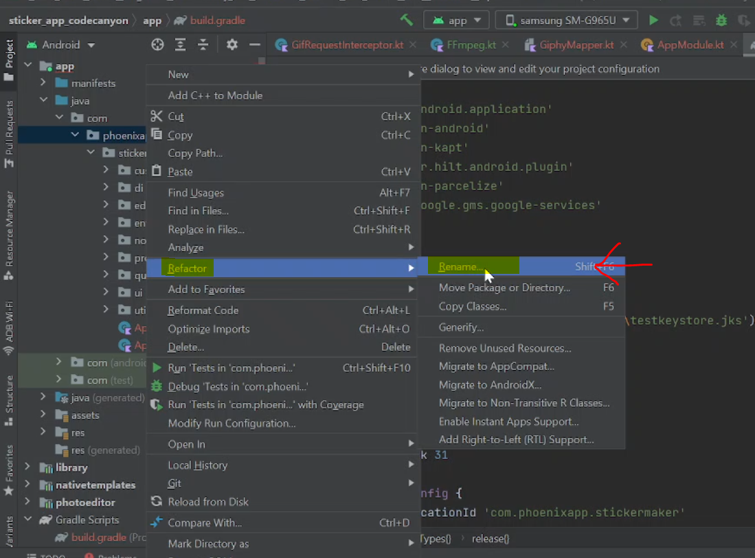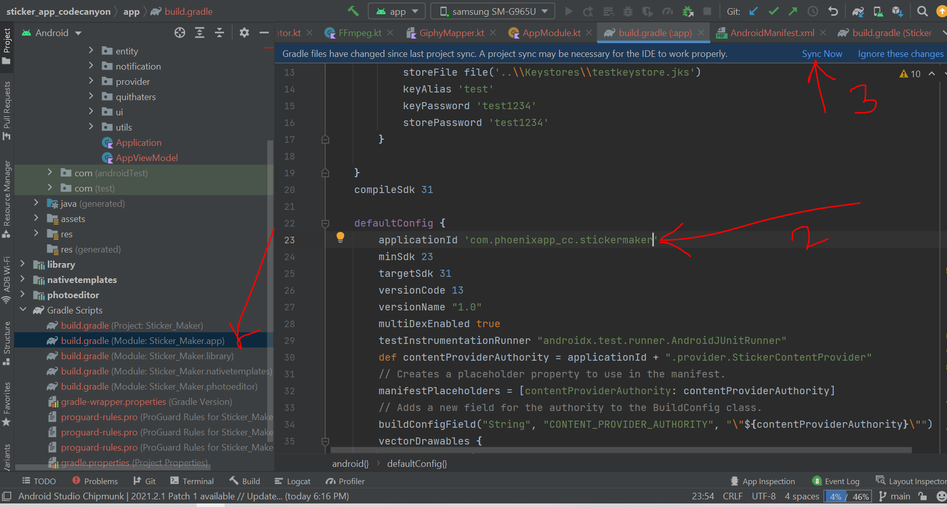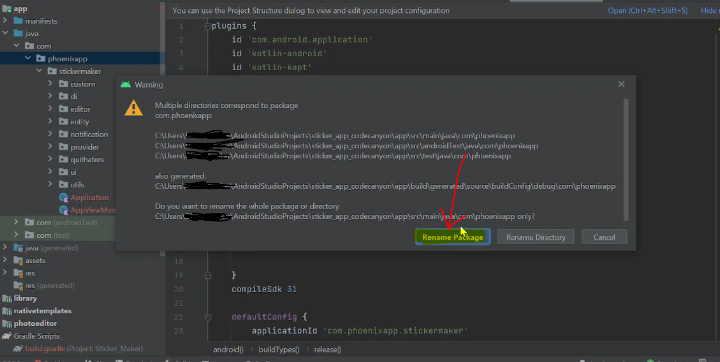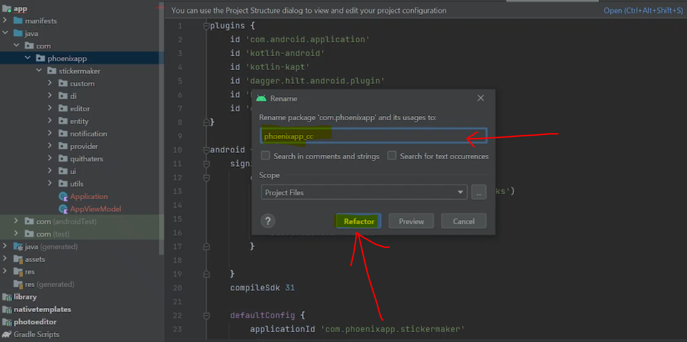 After Download , install and open the project on Android Studio , now you need to config your source code and make it ready by change package name config.
